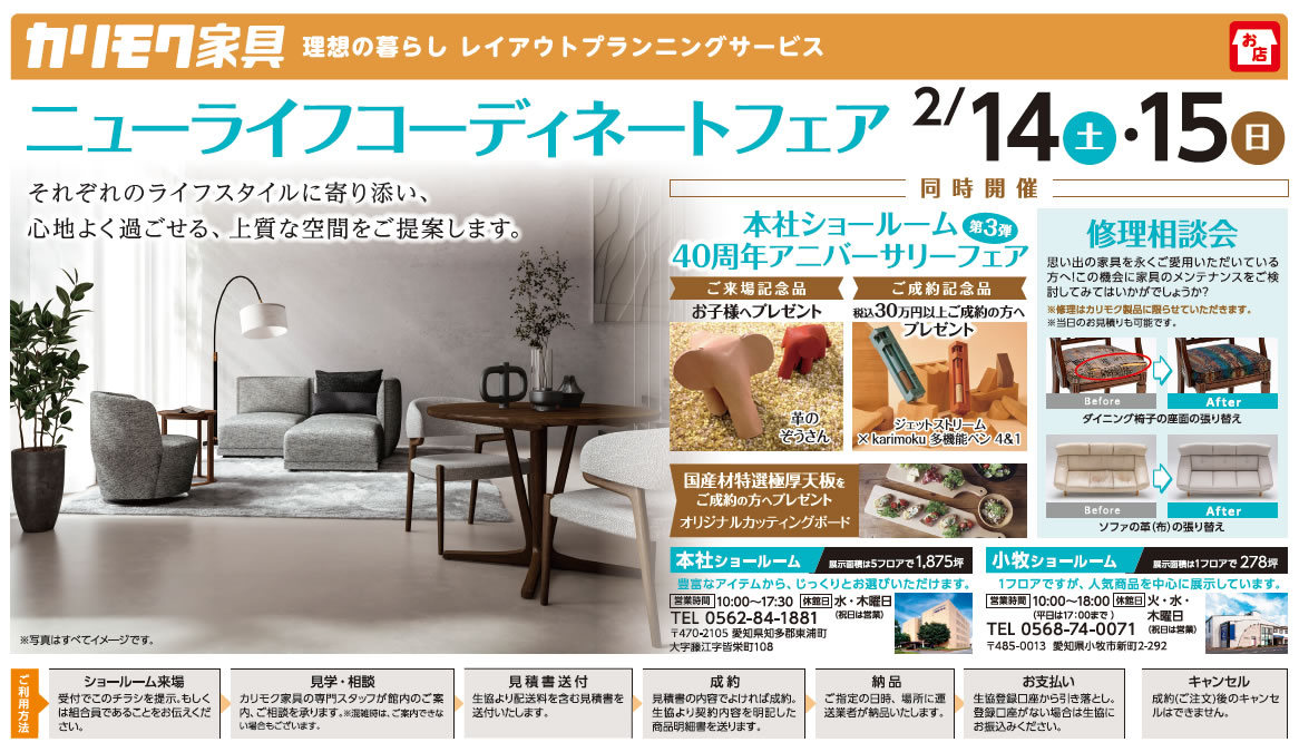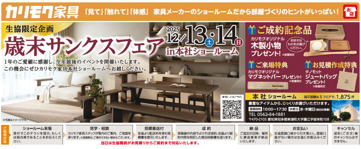 チラシもしくは組合員カードをご持参の上、本社・小牧・緒川アウトレット展示場へお越しください。