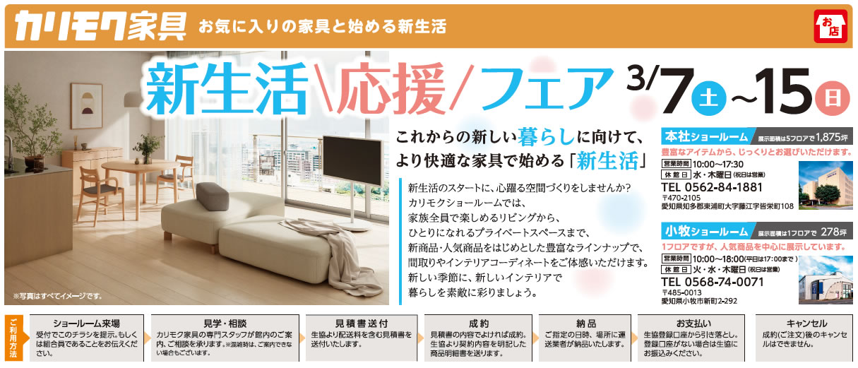 品質・規格・保証・アフターメンテナンスが万全。国内生産のカリモク家具を生協組合員価格(一部除く)にて、ご利用いただけます。