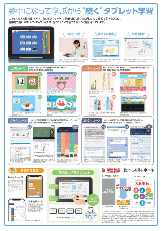 ※お申し込み後6か月未満で退会した場合は29,820円(税込32,802円)、6か月以上12か月未満で退会した場合は6,980円(税込7,678円)のタブレット代を請求させていただきます。12回払いの場合は入会のご案内およびWebサイトをご確認ください。